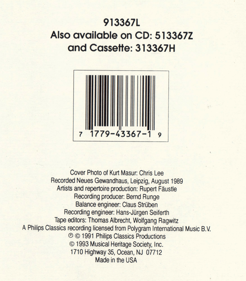 下圖便是這張《偉大》交響曲唱片封底一角,天啊,我之前都沒有注意到,這唱片居然都印有"一維條碼"( 我用手機的『QuickMark』APP 掃了一下,讀到的數據是 --- 717794336719,哇,共 12 位數啊 );好啦,本專輯除了黑膠,還同步有 CD 及卡帶的發行,從封底資料吾人可以清楚知道此錄音 --- 錄音日期為 1989 年 8 月( 錄音地點是甫於 1988 年完工啟用的布商大廈音樂廳 ),其中亦詳細記載了專輯製作人、錄音工程師等,但必考重點是...本錄音係由寶麗金國際音樂授權之飛利浦唱片於 1991 年製作,MHS 唱片 1993 年發行,嗯,原來是 MHS 買 PHILIPS 的版權發行,然後我的認知是...這個錄音我的功課到此便交卷,不然呢? |