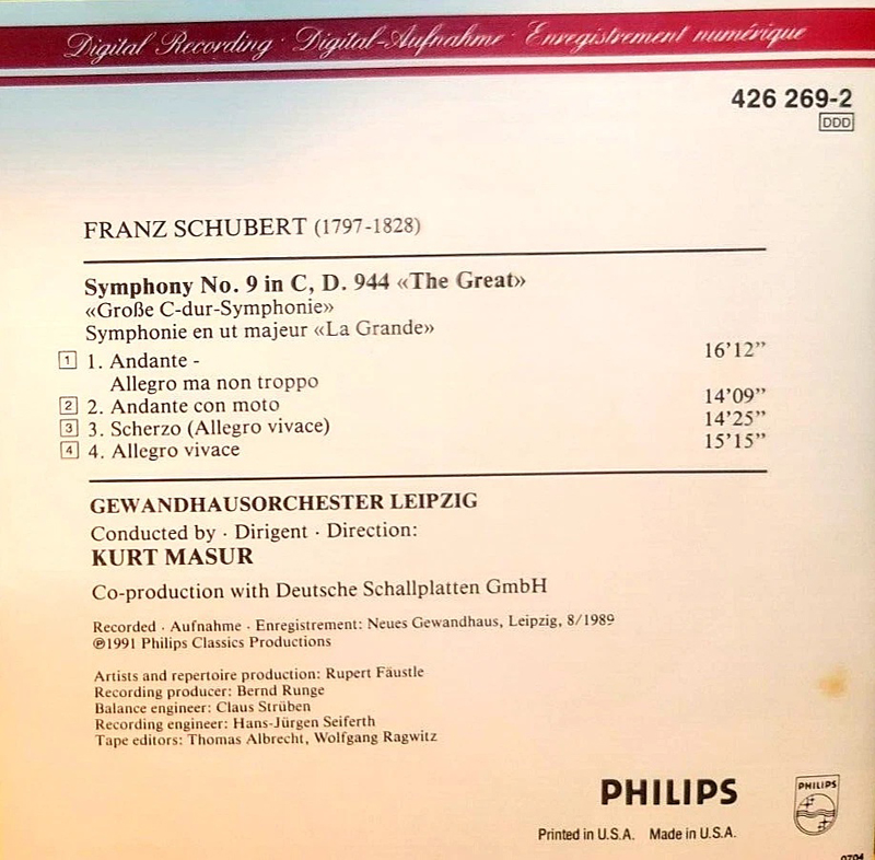 或許是讀了前文之故,我始終對活躍於前東德時期的音樂家們很是佩服,我應該是把這個觀點在廣播中說了出來,沒料到這件事被一位南方客戶聽見,他在收音機前聽完馬舒指揮的舒伯特第九號交響曲後便立志收藏一張 CD 來珍藏,幾年過去他終於如願,於是他老兄某日抽空來訪,他告訴我的事真帶給我無限驚喜...。 |